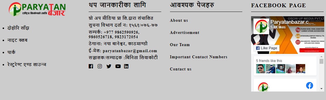 paryatanbazar.com is a tourism online news portal. Paryatan Bazar is under Grow up Media Pvt. Ltd. We scatter tourism news, views, interviews, current affairs, gossips, success stories, reports, and global diaspora. We have a strong belief that we can set the benchmark of the online news portal taking it into new heights of professionalism and practice of ethical journalism.